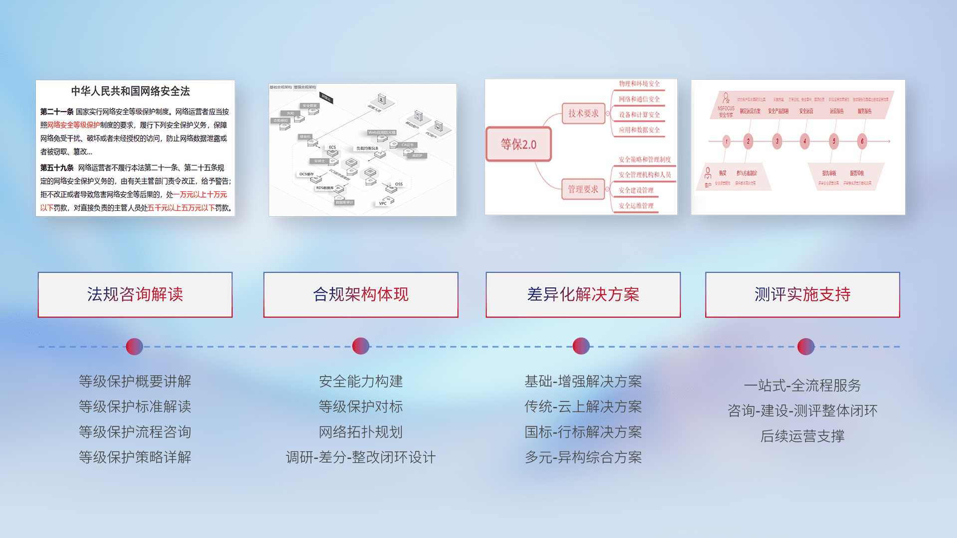 通过专业的法律咨询解读、、、、合规架构体现、、差异化解决方案、、、、测试实施支持等服务,,为客户量身打造等保合规体系。。。